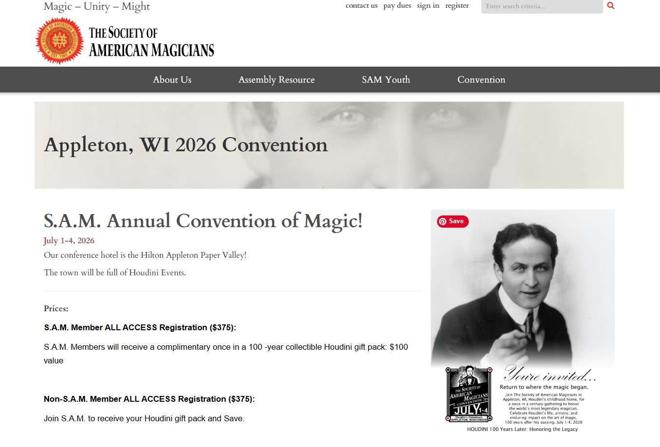 Join The Society of American Magicians in Appleton, Wl, Houdini’s childhood home, for a once in a century gathering to honor the world’s most legendary magician.